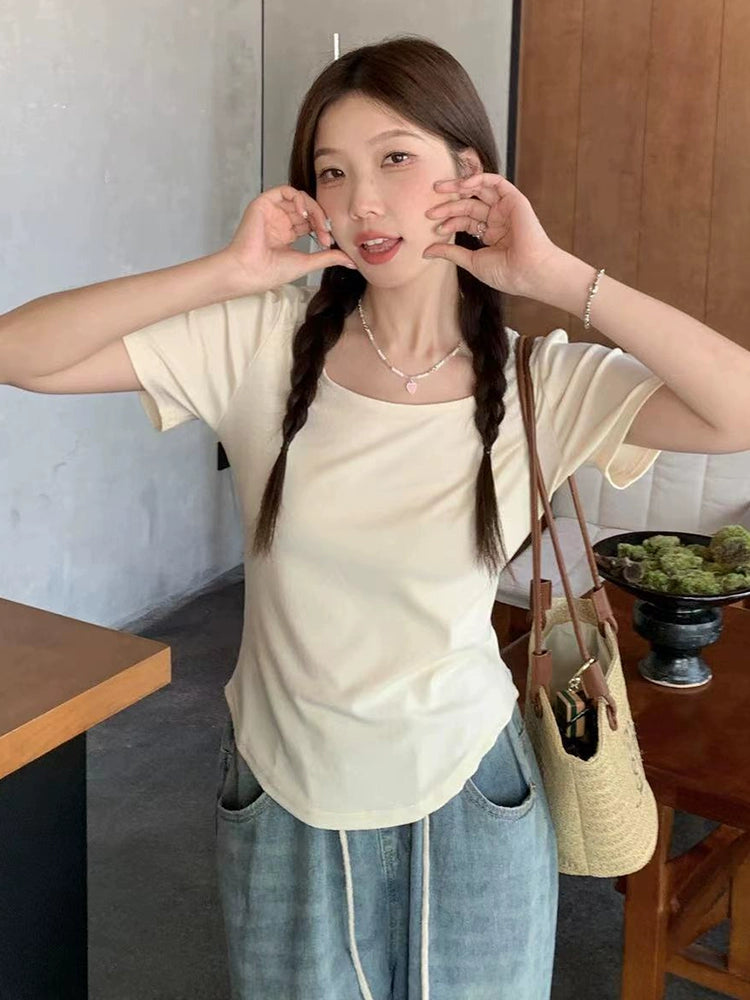 Plus Size Plus Size Ladies Belly Covering Chic Square Collar Fashionable T-shirt